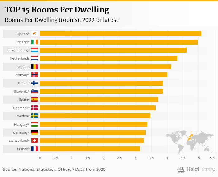 Based on a comparison of 25 countries in 2022, Cyprus ranked the highest in rooms per dwelling with 5.09 rooms followed by Ireland and Luxembourg. On the other end of the scale was Bulgaria with 2.12 rooms, Greece with 2.15 rooms and Italy with 2.39 rooms.