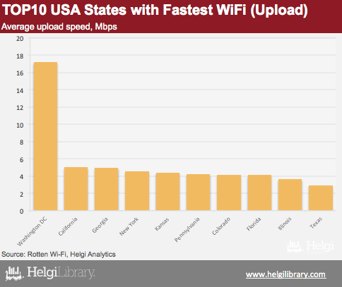 Washington provides the Internt connection with average download speed of 24.57 Mbps and 17.16 Mbps upload, where average clients’ satisfaction rank is 5.82 out of 10, based on NPS (Net Promoter Score) method. Two and a half times slower WiFi is in California where average download speed reached 10.09 Mbps and upload – 5 Mbps.
