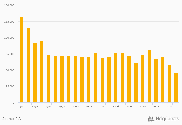 Historically, total coal consumption in Ukraine reached an all time high of 132,331 kt in 1992 and an all time low of 45,503 kt in 2015. When compared to Ukraine's main peers, total coal consumption in Poland amounted to 148,717 kt, 29,771 kt in Romania and 228,176 kt in Russia in 2015.