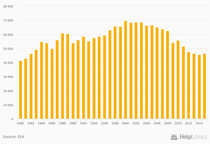 Historically, total coal consumption in Canada reached an all time high of 69,616 kt in 2000 and an all time low of 41,321 kt in 1980. When compared to Canada's main peers, total coal consumption in Australia amounted to 130,585 kt, 24,251 kt in Mexico, 41,195 kt in United Kingdom and 798,155 kt in USA in 2015.