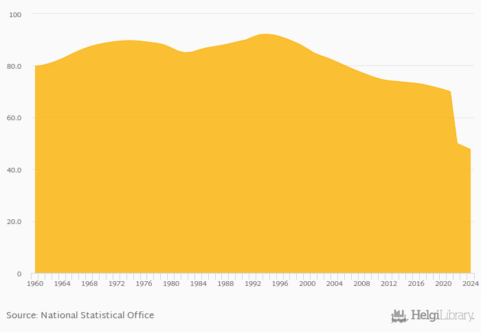 Historically, total dependency ratio in Pakistan reached an all time high of 92.1% in 1994 and an all time low of 47.6% in 2024. When compared to Pakistan's main peers, total dependency ratio in Afghanistan amounted to 60.5%, 39.1% in China, 42.6% in India and 38.4% in Iran in 2024.