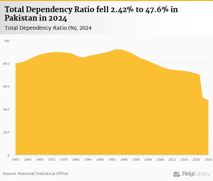 Total dependency ratio fell 2.42% to 47.6% in Pakistan in 2024, according to the National Statistical Office.