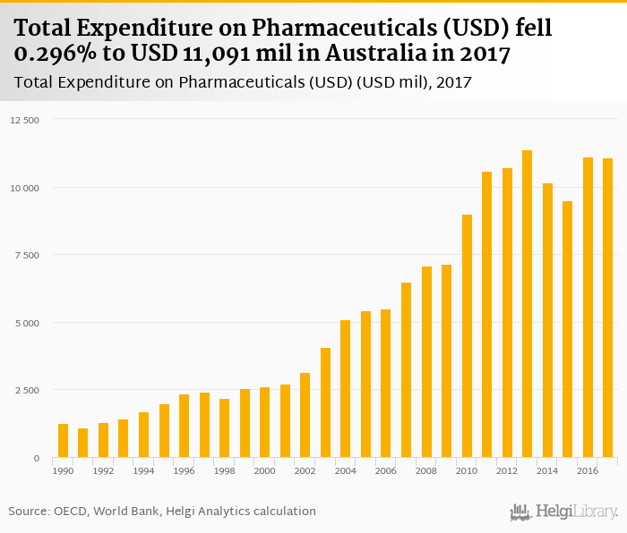 Total expenditure on pharmaceuticals fell 0.296% to USD 11,091 mil in Australia in 2017, according to OECD.