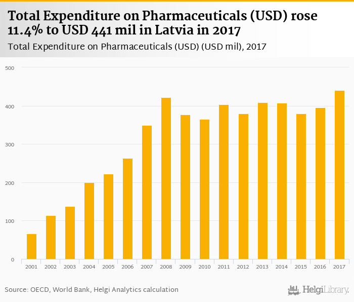 Total expenditure on pharmaceuticals rose 11.4% to USD 441 mil in Latvia in 2017, according to OECD.