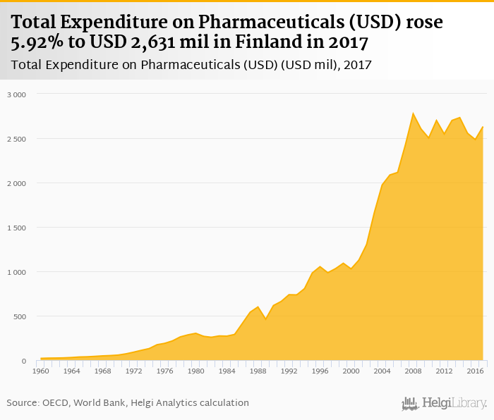 Historically, total expenditure on pharmaceuticals in Finland reached an all time high of USD 2,773 mil in 2008 and an all time low of USD 19.5 mil in 1960.