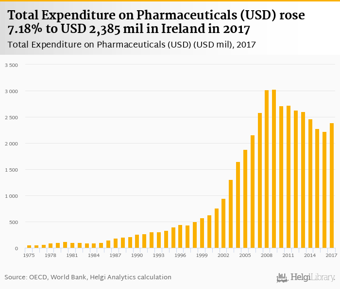 Total expenditure on pharmaceuticals rose 7.18% to USD 2,385 mil in Ireland in 2017, according to OECD.