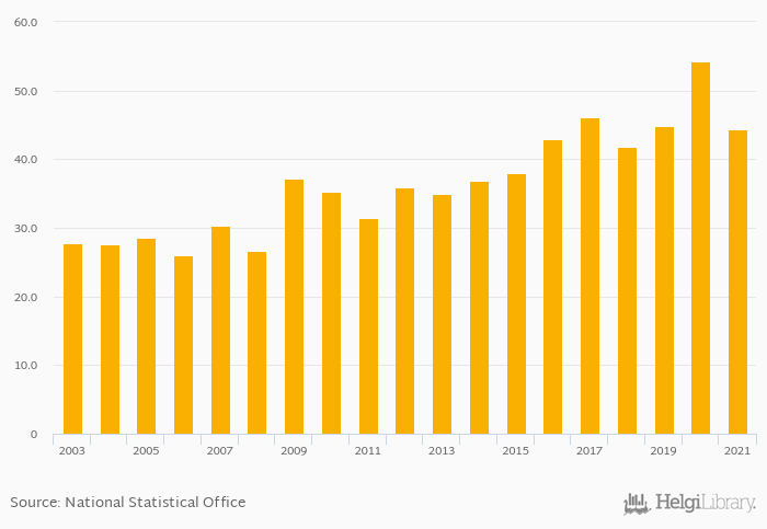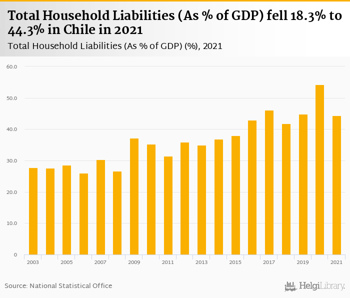 Total household liabilities as of GDP fell 18.3% to 44.3% in Chile in 2021, according to OECD.
