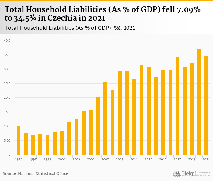 Total household liabilities as of GDP fell 7.09% to 34.5% in Czechia in 2021, according to OECD.