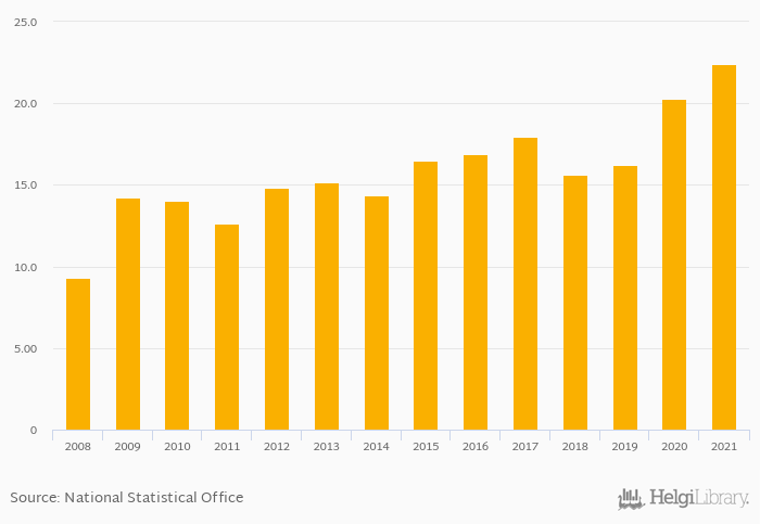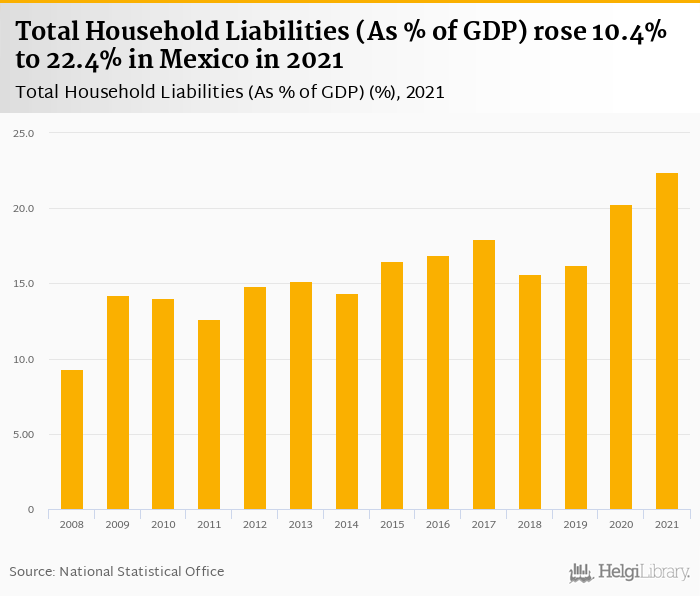 Total household liabilities as of GDP rose 10.4% to 22.4% in Mexico in 2021, according to OECD.