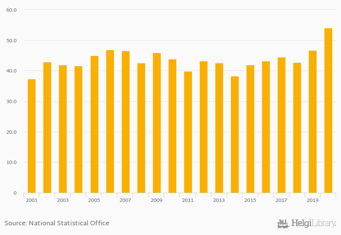 Historically, total household liabilities as of GDP in Israel reached an all time high of 54.2% in 2020 and an all time low of 37.3% in 2001.