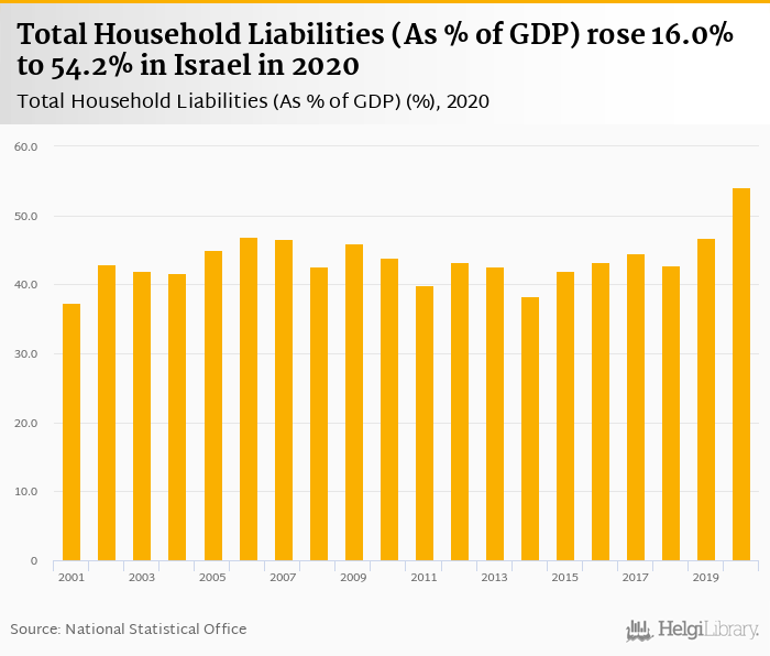 Total household liabilities as of GDP rose 16.0% to 54.2% in Israel in 2020, according to OECD.