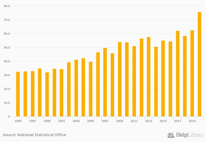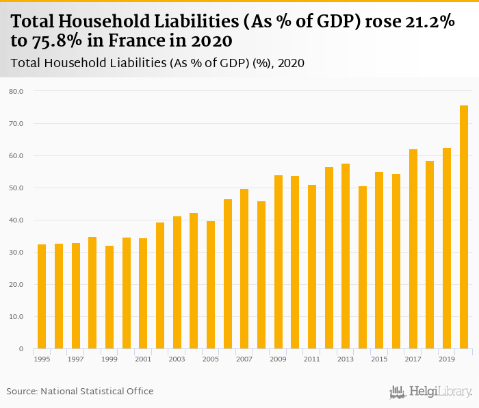 Total household liabilities as of GDP rose 21.2% to 75.8% in France in 2020, according to OECD.