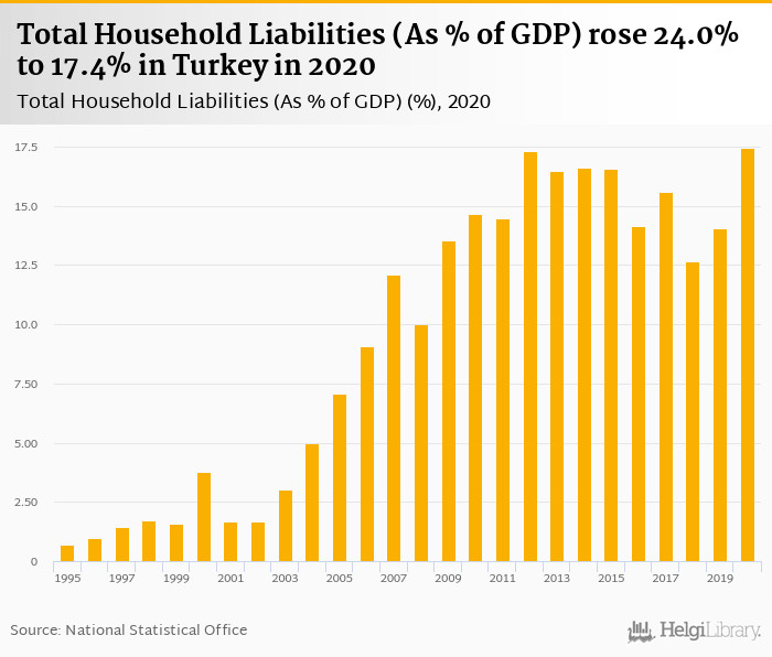 Total household liabilities as of GDP rose 24.0% to 17.4% in Turkey in 2020, according to OECD.