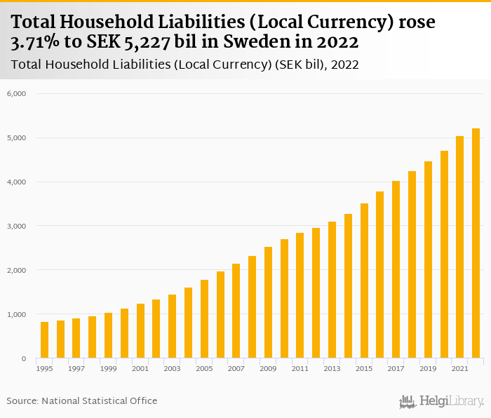 Total household liabilities rose 3.71% to SEK 5,227 bil in Sweden in 2022, according to OECD.