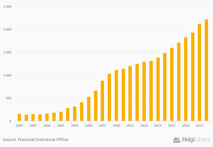Historically, total household liabilities in Czechia reached an all time high of CZK 2,214 bil in 2022 and an all time low of CZK 140 bil in 1996. When compared to Czechia's main peers, total household liabilities in Austria amounted to EUR 218 bil, HUF 12,309 bil in Hungary, PLN 817 bil in Poland and EUR 5,228 bil in Slovakia in 2022.