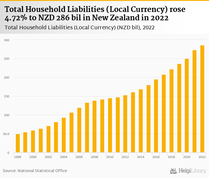 Historically, total household liabilities in New Zealand reached an all time high of NZD 286 bil in 2022 and an all time low of NZD 49.2 bil in 1998.