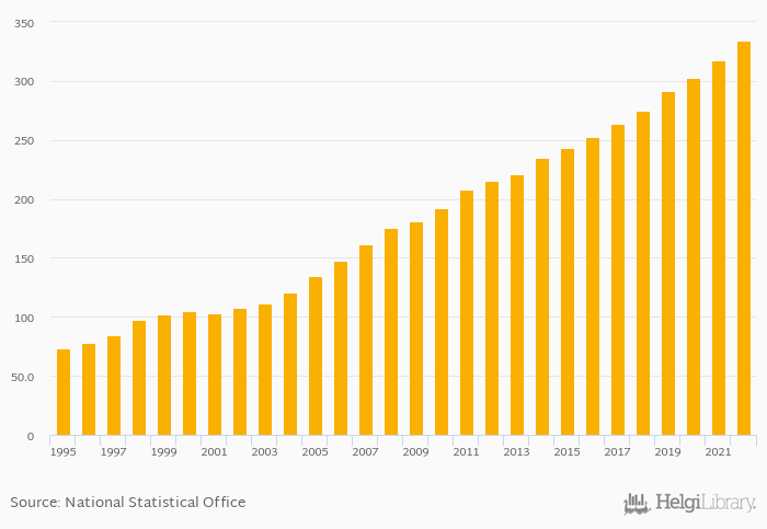 Historically, total household liabilities in Belgium reached an all time high of EUR 334 bil in 2022 and an all time low of EUR 73.2 bil in 1995. When compared to Belgium's main peers, total household liabilities in France amounted to EUR 1,748 bil, EUR 2,130 bil in Germany, EUR 52.5 bil in Luxembourg and EUR 896 bil in Netherlands in 2022.