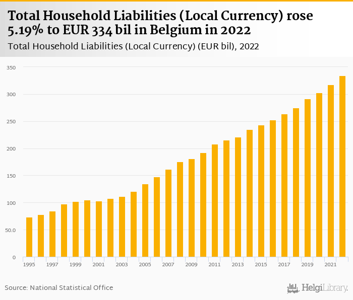 Total household liabilities rose 5.19% to EUR 334 bil in Belgium in 2022, according to OECD.