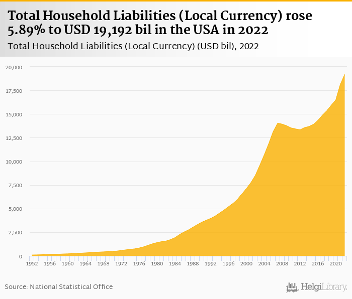 Total household liabilities rose 5.89% to USD 19,192 bil in the USA in 2022, according to OECD.