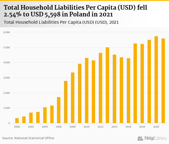 Total household liabilities per capita fell 2.54% to USD 5,598 in Poland in 2021, according to OECD.