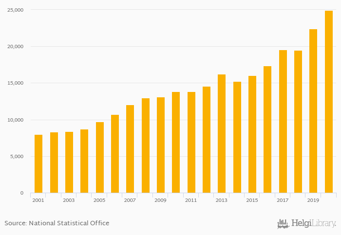 Historically, total household liabilities per capita in Israel reached an all time high of USD 24,934 in 2020 and an all time low of USD 7,950 in 2001.