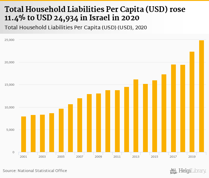 Total household liabilities per capita rose 11.4% to USD 24,934 in Israel in 2020, according to OECD.