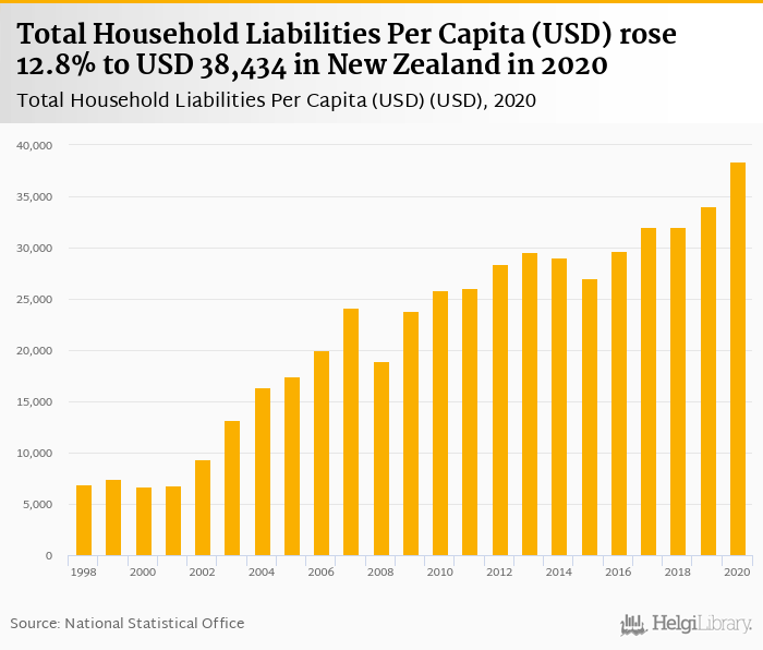 Total household liabilities per capita rose 12.8% to USD 38,434 in New Zealand in 2020, according to OECD.