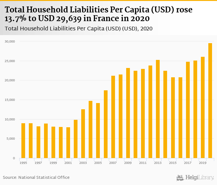 Total household liabilities per capita rose 13.7% to USD 29,639 in France in 2020, according to OECD.