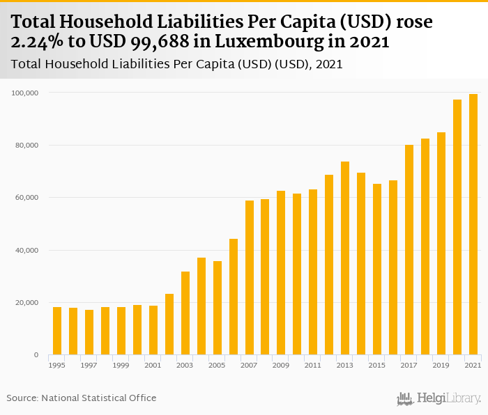 Total household liabilities per capita rose 2.24% to USD 99,688 in Luxembourg in 2021, according to OECD.