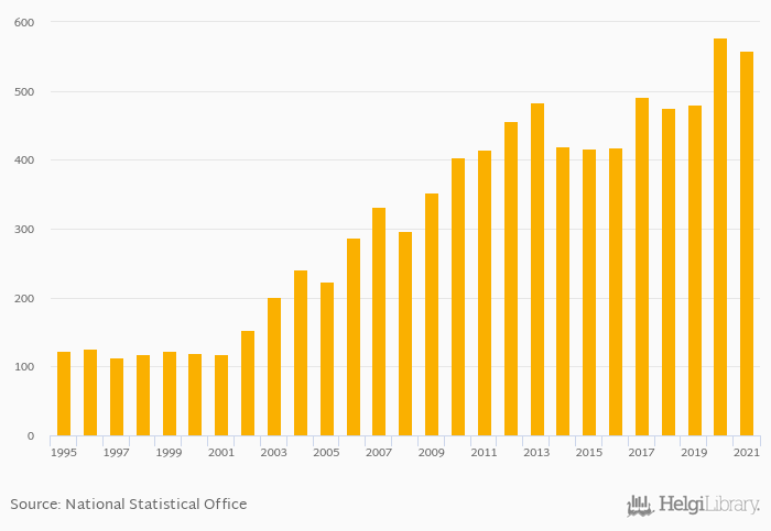 Historically, total household liabilities in Sweden reached an all time high of USD 577 bil in 2020 and an all time low of USD 114 bil in 1997.