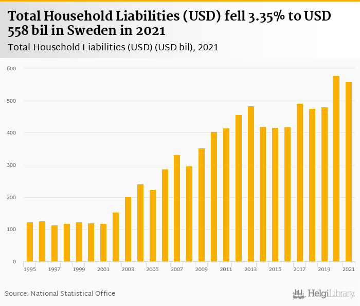 Total household liabilities fell 3.35% to USD 558 bil in Sweden in 2021, according to OECD.