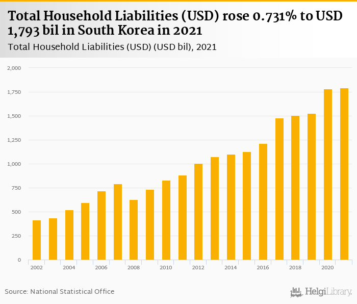 Total household liabilities rose 0.731% to USD 1,793 bil in South Korea in 2021, according to OECD.