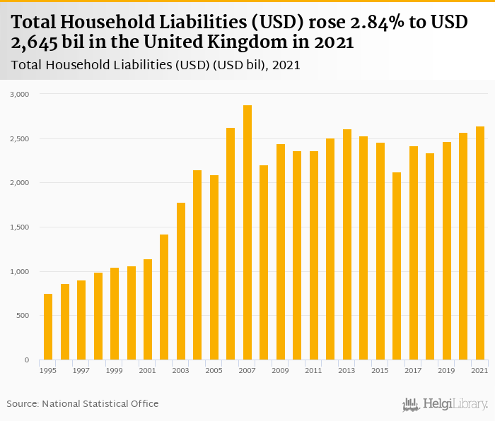 Total household liabilities rose 2.84% to USD 2,645 bil in the United Kingdom in 2021, according to OECD.