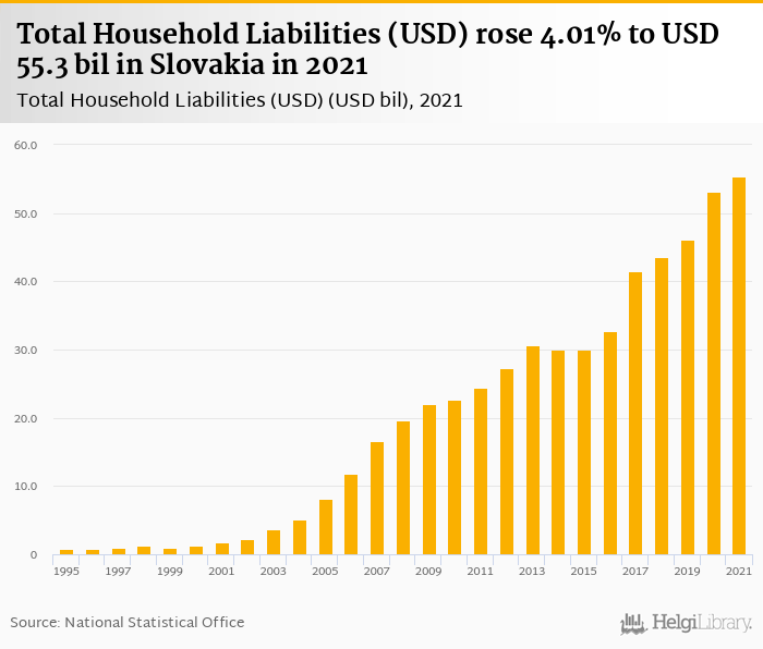 Total household liabilities rose 4.01% to USD 55.3 bil in Slovakia in 2021, according to OECD.