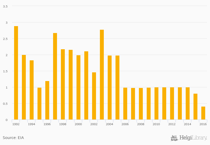 Total oil supply fell 49.5% to 0.407 '000 bpd in Georgia in 2016, according to EIA.