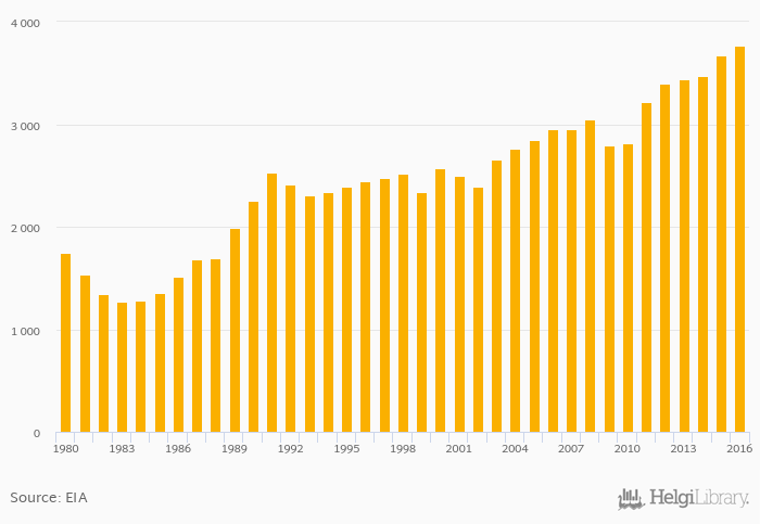 Total oil supply rose 2.50% to 3,765 '000 bpd in United Arab Emirates in 2016, according to EIA.