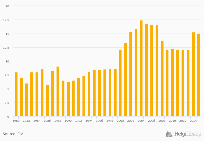 Total petroleum consumption fell 1.52% to 15.0 '000 bpd in Madagascar in 2015, according to EIA.