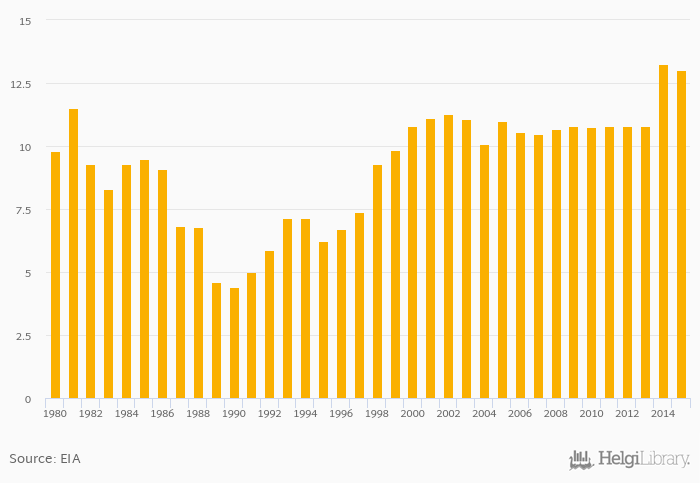 Total petroleum consumption fell 1.90% to 13.0 '000 bpd in Guyana in 2015, according to EIA.