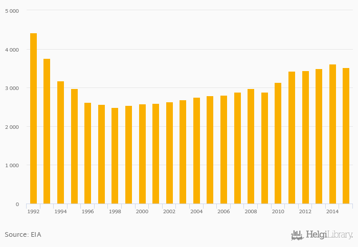 Historically, total petroleum consumption in Russia reached an all time high of 4,423 '000 bpd in 1992 and an all time low of 2,489 '000 bpd in 1998. When compared to Russia's main peers, total petroleum consumption in China amounted to 12,376 '000 bpd, 2,368 '000 bpd in Germany, 4,120 '000 bpd in Japan and 19,533 '000 bpd in USA in 2015.