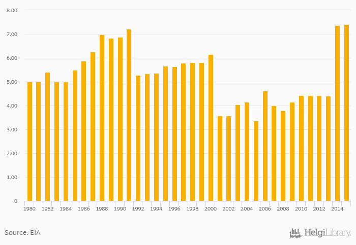Total petroleum consumption rose 0.625% to 7.40 '000 bpd in Sierra Leone in 2015, according to EIA.