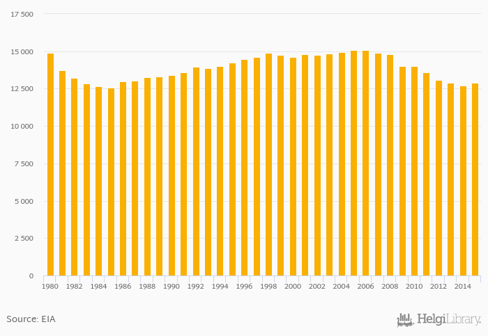 Historically, total petroleum consumption in the European Union reached an all time high of 15,069 '000 bpd in 2005 and an all time low of 12,569 '000 bpd in 1985. When compared to European Union's main peers, total petroleum consumption in China amounted to 12,376 '000 bpd, 4,120 '000 bpd in Japan, 3,512 '000 bpd in Russia and 19,533 '000 bpd in USA in 2015.