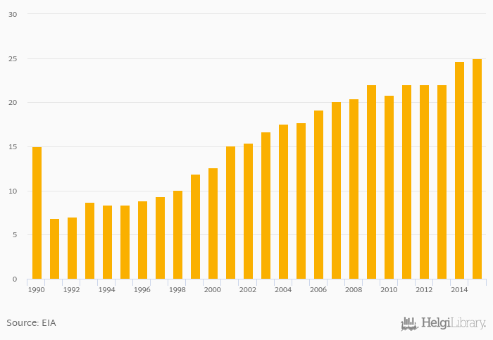 Total petroleum consumption rose 1.54% to 25.0 '000 bpd in Namibia in 2015, according to EIA.