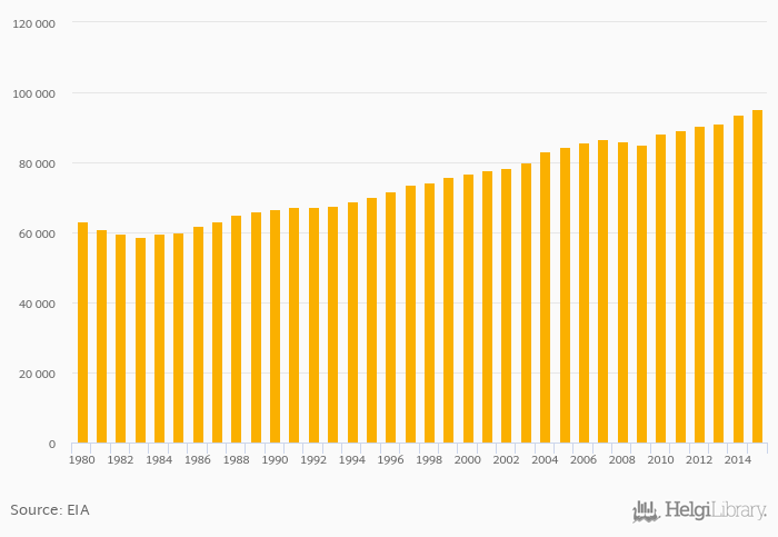 Total petroleum consumption rose 1.89% to 95,345 '000 bpd in the World in 2015, according to EIA.