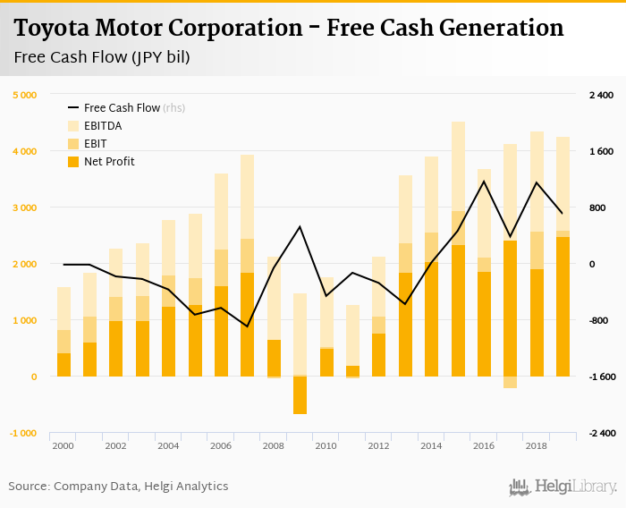 The company generated cash, defined by a sum of net profit and depreciation, of JPY 4,137 bil or 13.5% of sales. When investments are excluded, free cash flow reached JPY 696 bil, or 2.28% of sales in 2019.