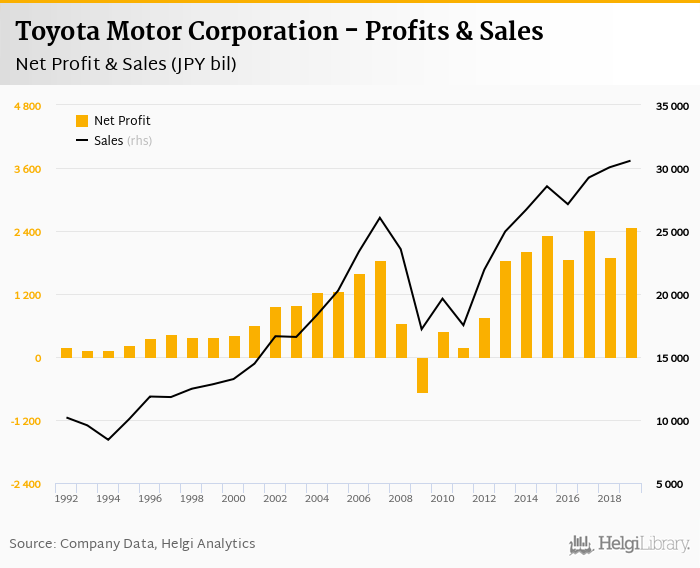 Toyota Motor Corporation made a net profit of JPY 2,473 bil in 2019, up 29.9% compared to the previous year. Total sales reached JPY 30,580 bil, which is up 1.74% when compared to the previous year.