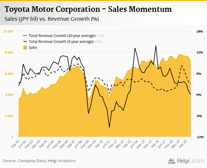 Toyota Motor Corporation generated sales of JPY 7,100 bil in 1Q2020, down 8.39% compared to the previous year. Historically, between 3Q1991 and 1Q2020, the company’s sales reached a high of JPY 7,802 bil in 4Q2018 and a low of JPY 2,309 bil in 1Q1994.