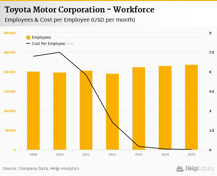Toyota Motor Corporation employed 349,766 employees in 2015, up 1.76% compared to the previous year. Historically, between 1999 and 2015, the firm's workforce hit a high of 349,766 employees in 2015 and a low of 210,709 employees in 1999.
