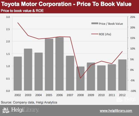 Toyota share has been trading at around 14-16x in terms of EV to EBITDA in the last years and 16x as of the end of 2012 in terms of price to earnings. As the Company's ROE dropped to below 10%, the Company traded at 1.3x multiple of its book value at the end of 2012, well below more than 2.0x seen in 2005-2006.