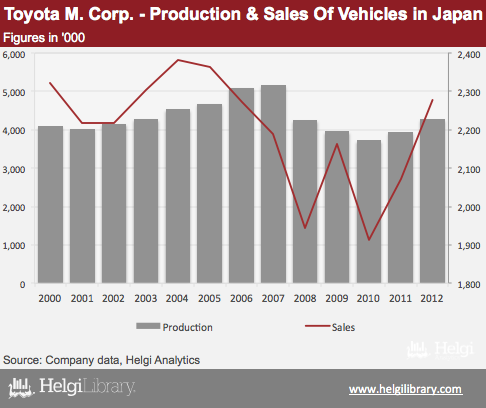 In 2012, the Company produced and sold 8.9 mil of passenger cars, up 45% compared to a decade ago. While only a half of total Toyota Group vehicles are produced in Japan now, three quarters are already exported (compared to 56% seen in 2002).