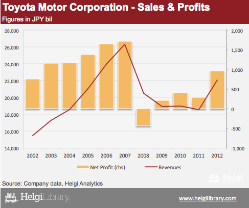 Toyota is one of the world's largest automobile manufacturers by production. In 2012, the Company reached total sales of USD 276 bil, twice as much as a decade ago. Following the effects of financial crisis and the USD 4 bil loss the Company made in 2008, Toyota has returned to a solid profitability, though ROE remains in the single digit territory. In 2012, the net profit reached USD 12.1 bil, twice as much as a decade ago. Net debt accounted for 76% of total equity, fairly stable level over the last ten years